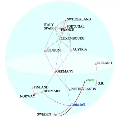 This idea also appears in Gaussian graphic models used in particular in genome mapping. But the iconography of correlations is more general in that it does not make an assumption about the Gaussian distribution, or not, of the variables, and relies only on the geometric aspect of the Correlation coefficient.