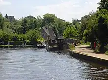 The weir is downstream of the lock, where the weir stream is joined by the mill stream.