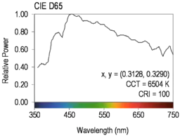 CIE standard illuminant D65 (sometimes written D65[1][2]) is a commonly used standard illuminant defined by the International Commission on Illumination (CIE).[3] It is part of the D series of illuminants that try to portray standard illumination conditions at open-air in different parts of the world.
