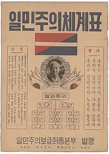 Ilminism (Korean: 일민주의; Hanja: 一民主義; RR: Ilminjuui), frequently translated as the One-People Principle,[14] One-People Doctrine,[6] or Unidemism, was the political ideology of South Korea under its first President, Syngman Rhee. The Ilminist principle has been likened by contemporary scholars to the Nazi ideal of the Herrenvolk (master race) and was part of an effort to consolidate a united and obedient citizenry around Rhee's strong central leadership through appeals to ultranationalism[6] and ethnic supremacy. In general, "Ilminists" often refers to pro-Syngman Rhee (groups).[15][16]