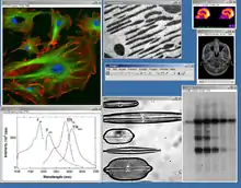 ImageJ is a Java-based image processing program developed at the National Institutes of Health and the Laboratory for Optical and Computational Instrumentation (LOCI, University of Wisconsin).[1][2] Its first version, ImageJ 1.x, is developed in the public domain, while ImageJ2 and the related projects SciJava, ImgLib2, and SCIFIO are licensed with a permissive BSD-2 license.[3] ImageJ was designed with an open architecture that provides extensibility via Java plugins and recordable macros.[4] Custom acquisition, analysis and processing plugins can be developed using ImageJ's built-in editor and a Java compiler. User-written plugins make it possible to solve many image processing and analysis problems, from three-dimensional live-cell imaging[5] to radiological image processing,[6] multiple imaging system data comparisons[7] to automated hematology systems.[8] ImageJ's plugin architecture and built-in development environment has made it a popular platform for teaching image processing.[9][10]