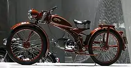 Riedel developed the engine at the same time.[2] This was a piston-ported two-stroke single-cylinder engine of 99 cc (6.0 cu in) capacity.[2][4][5] The engine was cast in light alloy around the cylinder liner, and had an integral cylinder head.[2] The crankshaft was suspended on only one side.[2][3] The power output of the engine was 4.5 PS (3.3 kW; 4.4 hp) at 5,800 rpm,[2] which was considered a high output at the time.[6][7] Contemporary engines of comparable size typically made about 2.5 PS (1.8 kW; 2.5 hp), and 4.5 PS was expected from 125 cc engines such as those used in the DKW RT 125[8] and the later Hoffmann Vespa.[9]