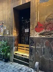 Improvised street bench in Naples (Italy), made from wooden pallet