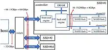 Webscale data center designers have been trying to develop storage architectures that favor high-capacity hosts. In the following figure (from [1]), such a storage system is shown where 64 SSDs are attached to a host. For the sake of simplicity, only the details of one SSD are demonstrated. Modern SSDs usually contain 16 or more flash memory channels which can be utilized concurrently for flash memory array I/O operations. Considering 512 MB/s bandwidth per channel, the internal bandwidth of an SSD with 16 flash memory channels is about 8 GB/s. This huge bandwidth decreases to about 1 GB/s due to the complexity of the host interface software and hardware architecture. In other words, the accumulated bandwidth of all internal channels of the 64 SSDs reaches the multiplication of the number of SSDs, the number of channels per SSD, and 512 MB/s (bandwidth of each channel) which is equal to 512 GB/s. While the accumulated bandwidth of the SSDs’ external interfaces is equal to 64 multiply by 1 GB/s (the host interface bandwidth of each SSD) which is 64 GB/s. However, In order to talk to the host, all SSDs required to be connected to a PCIe switch. Hence, the available bandwidth of the host is limited to 32 GB/s.