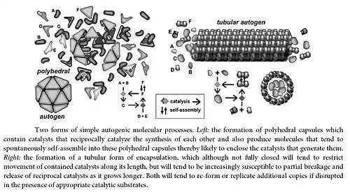 Reciprocal catalysis: An autogen consists of two self catalyzing cyclical morphodynamic chemical reactions, similar to a chemoton. In one reaction, organic molecules react in a looped series, the products of one reaction becoming the reactants for the next. This looped reaction is self amplifying, producing more and more reactants until all the substrate is consumed. A side product of this reciprocally catalytic loop is a lipid that can be used as a reactant in a second reaction. This second reaction creates a boundary (either a microtubule or some other closed capsid like structure), that serves to contain the first reaction. The boundary limits diffusion; it keeps all of the necessary catalysts in close proximity to each other. In addition, the boundary prevents the first reaction from completely consuming all of the available substrate in the environment.
