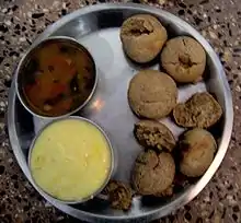 Bihari cuisine may include litti chokha,[56] a baked salted wheat-flour cake filled with sattu (baked chickpea flour) and some special spices, which is served with baigan bharta,[57] made of roasted eggplant (brinjal) and tomatoes.[58][59]