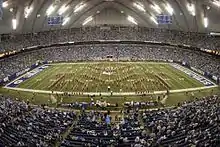 The Marching Hundred (or Hundred) is the marching band of Indiana University. The Marching Hundred is the product of tradition dating back to the organization of the first band at Indiana in 1896, which was founded to provide recreation for interested students. The 22-piece band of 1896 grew to 47 members by 1913.[1] The current band performs at all home Indiana Hoosiers football games, one away game, several campus events, and bowl game appearances. Toward the end of each season, the Marching Hundred holds an annual Showcase Concert in Indiana University's Assembly Hall. The Marching Hundred is the recipient of the 2007 Sudler Trophy. In 2012, the Marching Hundred performed a five-minute pregame show at Super Bowl XLVI.[2]
