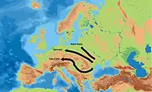 The western Indo-European languages (Germanic, Celtic, Italic) probably spread into Europe from the Balkan-Danubian complex, a set of cultures in Southeastern Europe.[3] At ca. 3000 BCE a migration of Proto-Indo-European speakers from the Yamna-culture took place toward the west along the Danube river,[4] Slavic and Baltic developed a little later at the middle Dniepr (present-day Ukraine),[5] moving north toward the Baltic coast.[45] The Corded Ware culture in Middle Europe (third millennium BCE),[web 1] which arose in the contact zone east of the Carpathian mountains, materialized with a massive migration from the Eurasian steppes to Central Europe,[8][web 2][9] probably played a central role in the spread of the pre-Germanic and pre-Balto-Slavic dialects.[6][7]