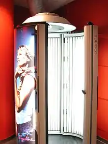 Indoor tanning involves using a device that emits ultraviolet radiation to produce a cosmetic tan.[lower-alpha 1] Typically found in tanning salons, gyms, spas, hotels, and sporting facilities, and less often in private residences, the most common device is a horizontal tanning bed, also known as a sunbed or solarium. Vertical devices are known as tanning booths or stand-up sunbeds.
