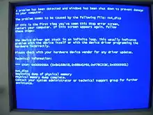 A blue screen of death on Windows XP. "The device driver got stuck in an infinite loop."