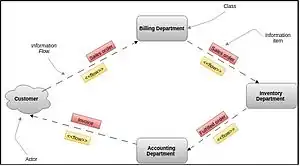 A dashed line with an open arrow pointing away from the source to the target is used to represent information flow. The keyword "flow" may be written above or below the dashed line. Information items represent the abstraction of data and act as information flow connectors, representing the flow of transfer of information from source to target. Information items do not provide any detail of the information they transfer as they are featureless.[4]