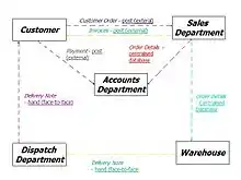 A customer needs to make an order. The customer first posts the order to the sales department. The customer's order details are then entered into a centralised database which can only be accessed by the warehouse to make the order. The goods are handed to the dispatch department with a delivery note attached to them for delivery. On delivery, the customer receives the goods and the delivery note (which are handled by a member of the dispatch department). The sales department then creates an invoice which is posted to the customer. The accounts department then assesses a copy of the invoice from the centralised database. The customer is then required to post the payment to the accounts department.[7]