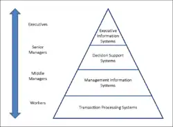The "classic" view of Information systems found in textbooks[28] in the 1980s was a pyramid of systems that reflected the hierarchy of the organization, usually transaction processing systems at the bottom of the pyramid, followed by management information systems, decision support systems, and ending with executive information systems at the top. Although the pyramid model remains useful since it was first formulated, a number of new technologies have been developed and new categories of information systems have emerged, some of which no longer fit easily into the original pyramid model.