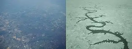 Visible vs. infrared (900 nm LP) aerial photography of Old Hickory Lake, Tennessee. Taken from a passenger airplane within seconds apart using a Sony H-9 Digital camera.