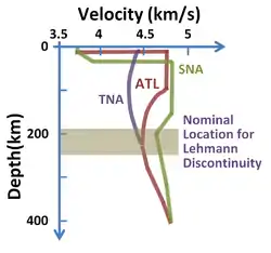 - Figure patterned after Don L Anderson (2007). New Theory of the Earth (2nd ed.). Cambridge University Press. p. 102, Figure 8.6. ISBN 978-0-521-84959-3.; Original figure attributed to Grand and Helmberger (1984)