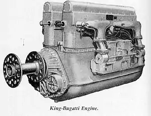 - Engines with two banks of cylinders side by side driving separate crankshafts geared to a single output, (e.g. Bugatti U-16).