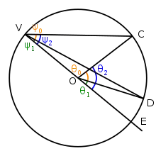 Given a circle whose center is point O, choose three points V, C, and D on the circle. Draw lines VC and VD: angle DVC is an inscribed angle. Now draw line VO and extend it past point O so that it intersects the circle at point E. Angle DVC subtends arc DC on the circle.