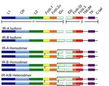 Initially, transcription of alternative splice variants derived from the INSR gene are translated to form one of two monomeric isomers; IR-A in which exon 11 is excluded, and IR-B in which exon 11 is included. Inclusion of exon 11 results in the addition of 12 amino acids upstream of the intrinsic furin proteolytic cleavage site.