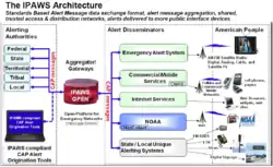 The Integrated Public Alert and Warning System (IPAWS) is an architecture that unifies the United States' Emergency Alert System, National Warning System, Wireless Emergency Alerts, and NOAA Weather Radio, under a single platform. IPAWS was designed to modernize these systems by enabling alerts to be aggregated over a network and distributed to the appropriate system for public dissemination.[1]