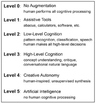 Ron Fulbright describes human cognitive augmentation in human/cog ensembles involving humans working in collaborative partnership with cognitive systems (called cogs). By working together, human/cog ensembles achieve results superior to those obtained by the humans working alone or the cognitive systems working alone. The human component of the ensemble is therefore cognitively augmented. The degree of augmentation depends on the proportion of the total amount of cognition done by the human and that done by the cog. Six Levels of Cognitive Augmentation have been identified: [13][14]