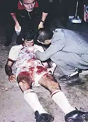 [60] After a 3–0 win at San Siro, Milan went to Buenos Aires to play Estudiantes at La Bombonera.[61][62][63] Estudiantes' players booted balls at the Milan team as they warmed up and hot coffee was poured on the Italians as they emerged from the tunnel by Estudiantes' fans. Estudiantes resorted to inflicting elbows and allegedly even needles at the Milanese team in order to intimidate them. Pierino Prati was knocked unconscious and continued for a further 20 minutes despite suffering from a mild concussion. Estudiantes goalkeeper Alberto Poletti also punched Gianni Rivera, but the most vicious treatment was reserved for Néstor Combin, an Argentinean-born striker, who had faced accusations of being a traitor as he was on the opposite side of the intercontinental match.[60][64][65]