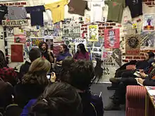 The archive is housed in an open floor-plan storefront space, filled to the ceiling.[2] The collection includes a number of different kinds of media artifacts which provide information and illustration about the histories of radical political movements around the world, with 40% of the archive coming from outside the United States.[8] Among the materials are posters, fliers, pamphlets, zines, stickers, T-shirts, books, graphic novels, newspapers, games, videos, leaflets, buttons, audio recordings, and other ephemera.[2][5][7] The topics it covers includes ACT-UP, Occupy Wall Street, Arab Spring, Code Pink, Pink Bloque, Rock for Choice, Latin American art, nature, ecology, feminism, punk rock, criminal justice, prison reform, apartheid, anti-nuclear movement, squatting, anarchist bookfairs, May 1968 events in France, and Dutch anti-fur activism.[5][8][13]