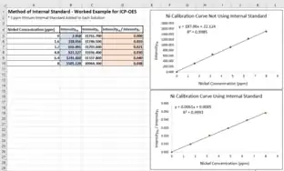 One way to visualize the internal standard method is to create one calibration curve that doesn't use the method and one calibration curve that does. Suppose there are known concentrations of nickel in a set of calibration solutions: 0 ppm, 1.6 ppm, 3.2 ppm, 4.8 ppm, 6.4 ppm, and 8 ppm. Each solution also has 5 ppm yttrium to act as an internal standard. If these solutions are measured using ICP-OES, the intensity of the yttrium signal should be consistent across all solutions. If not, the intensity of the nickel signal is likely imprecise as well.