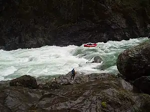 The international scale of river difficulty is an American system used to rate the difficulty of navigating a stretch of river, or a single (sometimes whitewater) rapid.[1] The scale was created by the American Whitewater Association to evaluate rivers throughout the world, hence international in the title.[2] It should not be confused with the internationally used whitewater scale, which is published and adapted by a committee of the International Canoe Federation (ICF).[3][4] The grade reflects the technical difficulty and skill level required associated with the section of river. The scale is of use to various water sports and activities, such as rafting, riverboarding, whitewater canoeing, stand up paddle surfing, and whitewater kayaking.[5]