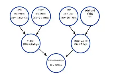 Up until the early 1990s, it was not thought possible that a television programme could be squeezed into the limited telecommunication bandwidth of a copper telephone cable to provide a video-on-demand (VOD) television service of acceptable quality, as the required bandwidth of a digital television signal was around 200 Mbit/s, which was 2,000 times greater than the bandwidth of a speech signal over a copper telephone wire. VOD services were only made possible as a result of two major technological developments: motion-compensated DCT video compression and asymmetric digital subscriber line (ADSL) data transmission.[3] Motion-compensated DCT algorithms for video coding standards include the H.26x formats from 1988 onwards and the MPEG formats from 1991 onwards.[4][5] Motion-compensated DCT video compression significantly reduced the amount of bandwidth required for a television signal, while at the same time ADSL increased the bandwidth of data that could be sent over a copper telephone wire. ADSL increased the bandwidth of a telephone line from around 100 kbit/s to 2 Mbit/s, while DCT compression reduced the required bandwidth of a digital television signal from around 200 Mbit/s down to about 2 Mbit/s. The combination of DCT and ADSL technologies made it possible to practically implement VOD services at around 2 Mbit/s bandwidth in the 1990s.[3]