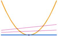 The guiding principle in the definition of intersection multiplicities of cycles is continuity in a certain sense. Consider the following elementary example: the intersection of a parabola y = x2 and an axis y = 0 should be 2 · (0, 0), because if one of the cycles moves (yet in an undefined sense), there are precisely two intersection points which both converge to (0, 0) when the cycles approach the depicted position. (The picture is misleading insofar as the apparently empty intersection of the parabola and the line y = −3 is empty, because only the real solutions of the equations are depicted).