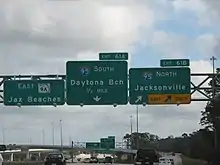 Interstate 295 (I-295), an auxiliary route of I-95, is a beltway around central Jacksonville, Florida. The 61.04-mile-long (98.23 km) beltway consists of two segments, the West Beltway (formerly signed as simply I-295) and the East Beltway (formerly signed as State Road 9A [SR 9A]), with I-95 serving as the dividing line between the two. The entire highway carries a hidden designation as SR 9A by the Florida Department of Transportation (FDOT).[2] The West Beltway was constructed in the 1970s, with the East Beltway being built from the 1980s to the 2000s.