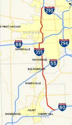 Interstate 355 (I-355), also known as the Veterans Memorial Tollway, is an Interstate Highway and tollway in the western and southwest suburbs of Chicago in the U.S. state of Illinois. Like most other toll roads in the northeastern portion of the state, I-355 is maintained by the Illinois State Toll Highway Authority (ISTHA). I-355 runs from I-80 in New Lenox north to I-290 in Itasca,[1] a distance of 32.5 miles (52.3 km).[lower-alpha 1] With the exception of a four-mile (6.4 km) expansion in 2009, from U.S. Route 34 (US 34, Ogden Avenue) to 75th Street, the highway is six lanes wide for its entire length.[2]