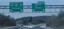On June 20, 1972, the American Association of State Highway Officials (AASHO) approved renumbering I-81E as I-380, along with extending I-84 concurrent with I-380 from Elmhurst Township north to I-81.[18] The renumbering was done in order to avoid the confusion of I-81E with the connecting I-80 and I-81 designations. The new I-380 designation and extended I-84 would take effect in mid-1973, with the new signs to be installed by June of that year.[19] In 1973, the northern section was upgraded to Interstate standards.[8] In 1974 and 1975, work commenced on the final sections from PA 307 to the Shutters Road underpass and Shutters Road to PA 435, respectively.[8] This included an interchange with I-84, and was opened to traffic in 1976 as an east–west highway with mileage-based exit numbers.[8] These mileage-based numbers were scrapped by 1977 and replaced with eight sequential numbers beginning in Scranton. Mileage-based exit numbers were revived in 2001 when the Pennsylvania Department of Transportation (PennDOT) renumbered its Interstate System exit numbers. I-380 was redesignated as a north–south highway so that its exit numbers would commence from I-80 in the south.[8]