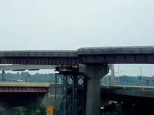 In 2005, an elevated section of the northbound exit 3 offramp slipped off its supports, causing temporary closure of the ramp and causing disruption of the flow of traffic into the Empire State Plaza. The ramp connects I-787 with the South Mall Arterial. Initially, most roads and ramps near or under the elevated highway were closed, but, once temporary piers were in place, most roads reopened. A detour was set up to allow northbound traffic to enter the plaza, but it required crossing the Hudson River over the Dunn Memorial Bridge and traveling through the city of Rensselaer to get back on the bridge, allowing access into the plaza.[21] The slip caused the south end of a simple span of the overpass to drop about two feet (0.61 m). The pier stands 80 feet (24 m) tall at the slippage point. Nobody was seriously injured by the slipped ramp.[22]