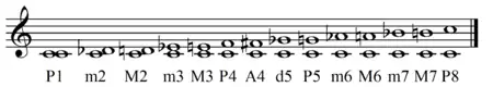 | 0 | Perfect unison | P1 | Diminished second | d2 | |||