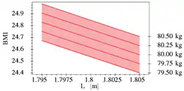 Height and body weight both affect the value of the BMI. Though the example above only considered variation in weight, height is also subject to uncertainty. Height measurements in meters are usually rounded to the nearest centimeter: a recorded measurement of 1.79 meters represents a height in the interval . Since the BMI uniformly increases with respect to weight and decreases with respect to height, the error interval can be calculated by substituting the lowest and highest values of each interval, and then selecting the lowest and highest results as boundaries. The BMI must therefore exist in the interval