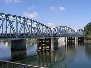 The Inuyama Bridge is a bridge over the Kiso River in Japan. It is an laced steel truss bridge which connects Kakamigahara in the Gifu Prefecture with Inuyama in the Aichi Prefecture. Meitetsu Inuyama Line runs on it.