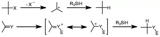 Upon the generation of a carbocation, rate-determining hydride transfer from the organosilane occurs to yield a reduced product. Retention of configuration at silicon has been observed in silane reductions of chiral triaryl methyl chlorides in benzene. This result suggests that the exchange of chlorine for hydrogen occurs through σ-bond metathesis.[3] Reductions in more polar solvents may involve silicenium ions.[4]