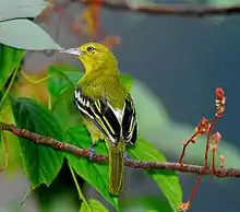 Their habitats include acacia scrub, forest edge, and closed forests, as well as agricultural land and (in the common iora) gardens.[6] They are generally lowland birds, with most reaching only as high as the submontane forests. They are generally highly arboreal and usually occur in the tree canopy, with only very rare records of this family coming down to the ground. The family is overwhelmingly non-migratory, although in West India there is some evidence that Marshall's ioras and common ioras are partly migratory in the seasonal semi-desert fringe.[5]