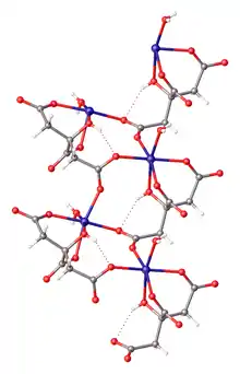 Ferrous citrate, also known as iron(II) citrate or iron(2+) citrate, describes coordination complexes containing citrate anions with Fe2+ formed in aqueous solution. Although a number of complexes are possible (or even likely), only one complex has been crystallized. That complex is the coordination polymer with the formula [Fe(H2O)6]2+{[Fe(C6H5O7)(H2O)]−}2.2H2O, where C6H5O73- is HOC(CH2CO2−)2(CO2−, i.e., the triple conjugate base of citric acid wherein the three carboxylic acid groups are ionized.[3] Ferrous citrates are all paramagnetic, reflecting the weak crystal field of the carboxylate ligands.[4]