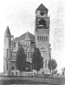 The Iron County Courthouse is a 2+1⁄2-story Richardsonian Romanesque building sitting on a hilltop overlooking Crystal Falls' business street.[2] It is built with reddish brown brick walls with stone trim atop a rubble masonry foundation. The front facade has a conical tower on one corner and a square wooden[5] tower topped by a belfry with hexagonal cupola on the other. A rock-face granite central archway contains the main entrance, which is approached via a stairway. Above the archway are the impressive 17-feet-high zinc statues representing Law, Mercy, and Justice.[2][5]