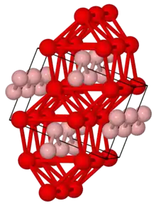 Fe2B contains single boron atoms in square anti-prismatic iron atom coordination. Boron atoms are separated from each other and the shortest B-B distance is 213 pm. Fe-B distance is 218 pm and Fe-Fe distance is 240–272 pm.[13]