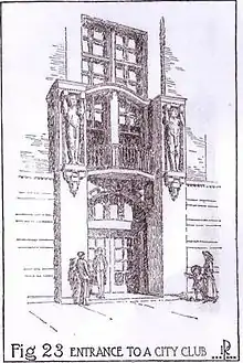 The new building embodied the soaring expectations of the reform movement, as well as providing the material comforts of a middle-class social club. Its two-story dining-lecture hall, complete with balcony and private eating chambers, accommodated over two hundred for the weekly luncheon talks on social and political issues of the day. ... Architect and club member Irving K. Pond declared that 'every line of the building illustrated some phase of the uplift movement.'[28]