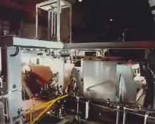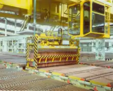 The original cathode stripping machine was based on that used at the Hikoshima plant of the Mitsui Mining and Smelting Company of Japan.[2] However, considerable development work was necessary to modify the design to handle the copper cathodes, which were heavier than those at Hikoshima, and to process the cathode plates without damaging them.[2] The machines also had to be redesigned to allow for waxing the sides and bottoms of the cathode plates to allow the next copper cathode sheets to be removed easily.[2]