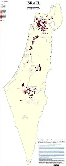 In 2020; approximately 35.2% of the Israeli Muslim population lived in the Northern District, 21.9% in the Jerusalem District, 17.1% in the Central District, 13.7% in the Haifa District, 10.9% in the Southern District, and 1.2% lived in the Tel Aviv District.[15] The Israeli Muslim population is young: around 33.4% of the Muslim population in Israel are of people aged 14 and under, while the percentage of people aged 65 and over is 4.3%, and the Muslim population in Israel had the highest fertility rate (3.16) compared with other religious communities.[15]