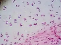 Chondrocytes develop in the embryo from mesenchymal progenitor cells through a process known as chondrogenesis.[2][3] A chondrocyte can then undergo mitosis to form an isogenous group within its lacuna.[3][4]