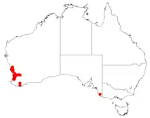 This isopogon grows in low open heath, often with soil derived from granite, from Harvey to near Jurien Bay in the south-west of Western Australia.[2][3]
