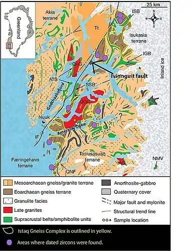The Isua Greenstone Belt, also known as the Isua supracrustal belt since it is composed primarily of supracrustal rocks, is located in southwestern Greenland, in the Isukasia terrane,[1] near the Nuuk capital region.[9] It forms the largest supracrustal enclave in the Itsaq Gneiss Complex, which predominantly comprises 3850 - 3600 million year old (Ma) felsic orthogneisses.[10] The greenstone belt comprises two major sequences of metamorphosed mafic volcanic and sedimentary rocks, which were divided on the basis of zircon uranium-lead dating. These sequences are the 'southern terrane', which has an age of approximately 3800 Ma, and the 'northern terrane', which has an age of approximately 3700 Ma.[3] The younger southern terrane is further subdivided into two subterranes: one predominantly comprising boninite-like metavolcanic rocks, and the other comprising tholeiitic and picritic metavolcanics.[3] The Isua Greenstone Belt is bounded to the West by the Ivinnguit Fault, which divides the Eoarachaean Itsaq Gneiss Complex from younger (Mesoarchaean) rocks of the Akia Terrane. Elsewhere, it is bounded by felsic orthogneisses of the Itsaq Gneiss Complex. These show a similar age division to the supracrustal rocks of the Isua Greenstone Belt itself, with 3800 Ma gneisses to the south of the belt, and 3700 Ma gneisses to the north of the belt.[3]