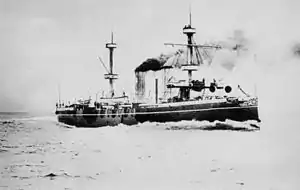 When Italy entered World War I on 23 May 1915, Piemonte was based in Brindisi and was assigned to the Second Fleet, which included the Regina Elena and Regina Margherita-class pre-dreadnought battleships and the Pisa and San Giorgio-class armored cruisers.[29] The primary naval opponent for the duration of the war was the Austro-Hungarian Navy; the Naval Chief of Staff, Admiral Paolo Thaon di Revel, planned a distant blockade with the battle fleet, while smaller vessels, such as the MAS boats conducted raids. The heavy ships of the Italian fleet would be preserved for a potential major battle in the event that the Austro-Hungarian fleet should emerge from its bases.[30] As a result, the ship's activities during the war was limited and she spent much of it based at Salonica, Greece, as part of the Anglo-French Levant Squadron. Plans to use her for torpedo trials after the war came to nothing and Piemonte was stricken from the Navy List on 15 May 1920 and broken up shortly afterwards.[12]