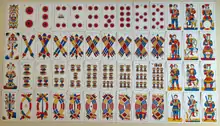 Closely related is the Triestine pack, which was created in the mid-19th century and was once available in 52 card sets but now only 40 card decks are sold.[5] Though ranks 8 through 10 were removed, the face cards are still numbered 11 through 13. The face cards are reversible with each half separated by a white caption box that labels the card. This is the only deck in which both face cards and pip cards are numbered though not always in the corner. This pattern is also found on Croatia's coast, corresponding with the Venetian Republic's Stato da Màr.